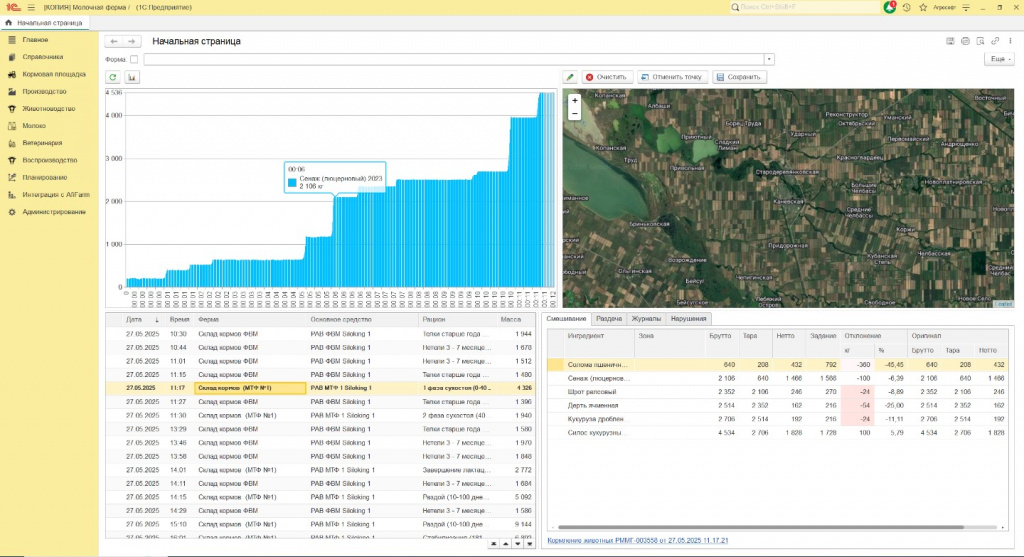 - Автоматизация списания: Акты списания кормов формируются автоматически на основе фактической загрузки.